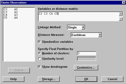 A partir de estos datos, queremos formar tres grupos homogéneos en los que queden enmarcados los diferentes países y extraer alguna conclusión. S O L U C I Ó N : Para realizar el análisis cluster de estos datos con Minitab hay que hacer lo siguiente: Stat / Multivariate / Cluster Observations... A continuación os aparecerá el siguiente cuadro, en el que deberéis poner las columnas en las que se encuentren las diferentes variables (en este caso C2, C3, C4 y C5), después marcar la opción Standardize variables (dado que las diferentes variables están en unidades diferentes), poner el número de clusters y, finalmente, marcar la opción Show dendrogram.