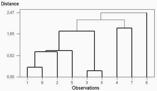 en el que se puede observar la ubicación de cada país. Dado que hemos marcado tres grupos, tenemos que los países se agrupan de la siguiente manera: 1.er grupo: Alemania, Reino Unido, Bélgica, Finlandia, España y Portugal 2.º grupo: Estados Unidos y Noruega 3.er grupo: Francia Si analizamos esta agrupación teniendo en cuenta los datos iniciales, podemos llegar a las siguientes conclusiones: la particularidad del tercer grupo está en el hecho de que si bien Francia tiene un gran número de hosts por cada mil habitantes, no tiene una gran proporción de usuarios de Internet ni de PC. Por tanto, para este grupo podemos hablar de un desarrollo parcial de la llamada sociedad del conocimiento. Por lo que respecta al segundo grupo, los rasgos más importantes son que tienen muchos hosts, al tiempo que un elevado porcentaje de usuarios y de PC. Siguiendo con el mismo razonamiento que antes, podríamos decir que Estados Unidos y Noruega son los países que han conseguido un desarrollo más equilibrado en el seno de la sociedad del conocimiento. Finalmente, para los países del tercer grupo, podríamos relacionarlos diciendo que son países que están en un fase todavía preliminar por lo que respecta al crecimiento de los indicadores que marcan la plena entrada en el uso de las tecnologías de la información y la comunicación en la sociedad. Como se puede observar en el dendrograma, en el mayor grupo, se aprecia que se podrían formar subgrupos. Así, de esta manera podemos ver una afinidad entre España y Portugal, entre Bélgica y Finlandia y entre Alemania y el Reino Unido. De la salida de Minitab también se obtiene más información, referente a la "distancia" entre grupos (es decir, entre sus centros o centroids). Así, tenemos lo siguiente: Distances Between Cluster Centroids