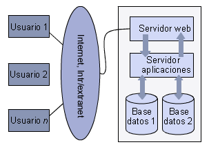 Los usuarios enviarían peticiones de páginas web mediante el protocolo HTTP. Esta petición viajaría a lo largo de la red hasta llegar al servidor web. El servidor web redirigiría la petición al elemento al que va dirigida, bien sea un elemento del propio servidor web o un elemento del servidor de aplicaciones. Se activaría toda la lógica de negocio que desencadenase esa petición y, si fuese necesario, se construiría la página de respuesta al usuario y se le enviaría. |