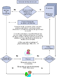 La consulta de fuentes impresas se hace a menudo de una manera mecánica, sin desarrollar explícitamente la estrategia, pero en determinados casos, cuando estamos ante consultas complejas, hay que planificar la estrategia de búsqueda. En el documento de J.A. Cordón García, J. López Lucas y J.R. Vaquero Pulido "La búsqueda bibliográfica" (consultad los documentos de lectura de la asignatura) podemos ver un diagrama de una búsqueda de fuentes impresas.