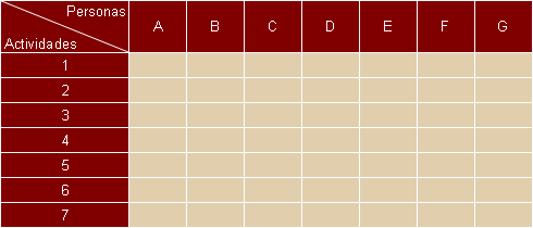 Una herramienta simple para reflejar la asignación de las actividades y responsabilidades es una tabla donde aparezcan las personas en horizontal, y en vertical, las actividades. En las intersecciones se marcan las tareas de cada persona con respecto a esta actividad.